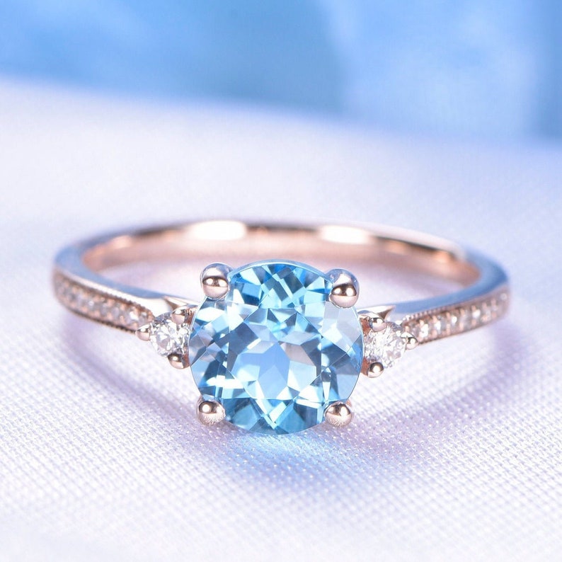 2CT Round Cut Cubic Zirconia Diamond Engagement Ring, 4 Prong Simulated Diamond Wedding Ring For Her, Aqua Blue Solitaire 3 Stone Women Ring