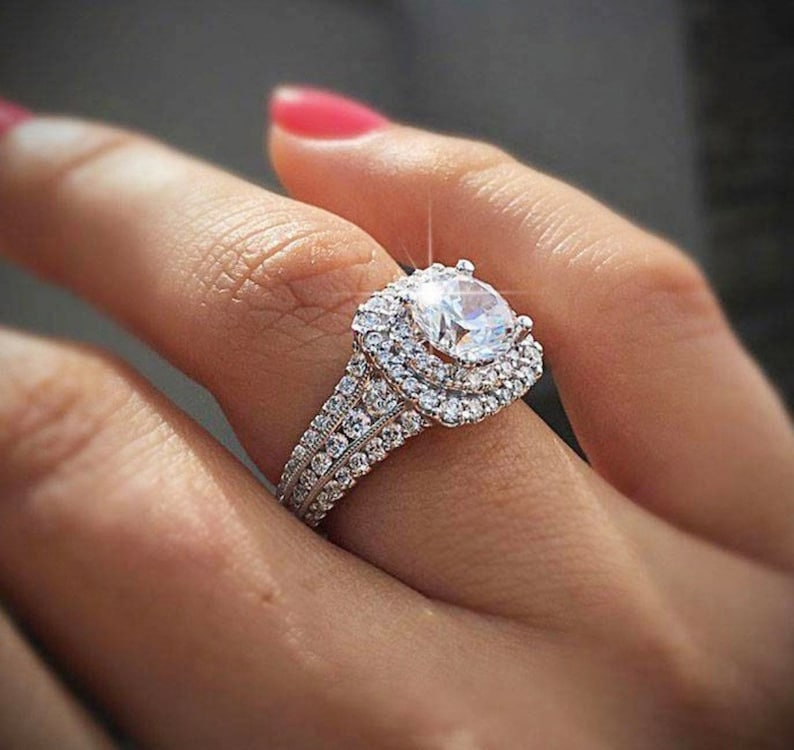 CZ Double halo ring, Cubic zirconia white diamond Engagement ring, double halo round cut ring, Promise ring, Anniversary ring for wife,